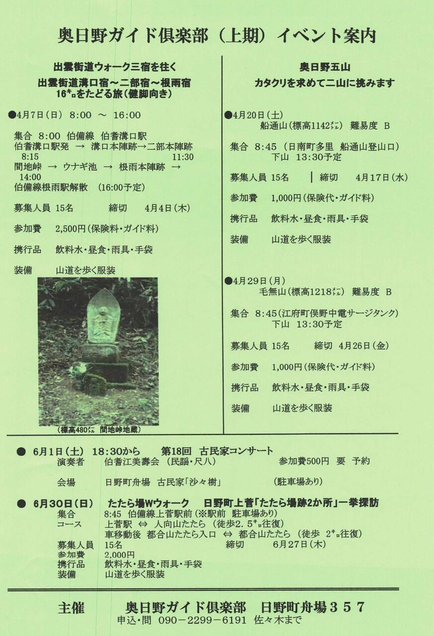 2024年上期イベント 2024年04月04日 4月7日 日曜日 出雲街道ウォーク4月20日 土曜日 船通山登山(1142m)難易度B4月29日 月曜日 毛無山登山(1218m)難易度B6月1日 土曜日 第18回 古民家コンサート6月30日 日曜日 たたら場ウォーク詳細は下記のチラシをご参照ください。各イベントには参加費、装備品などご準備いただくものがございます。要確認の上ご参加くださいませ。※定員になり次第、募集を締め切ることがございます。申し込み・問い合わせ 090‐2299‐6191 佐々木まで 「お知らせ」カテゴリの最新記事 < 前の記事次の記事 >